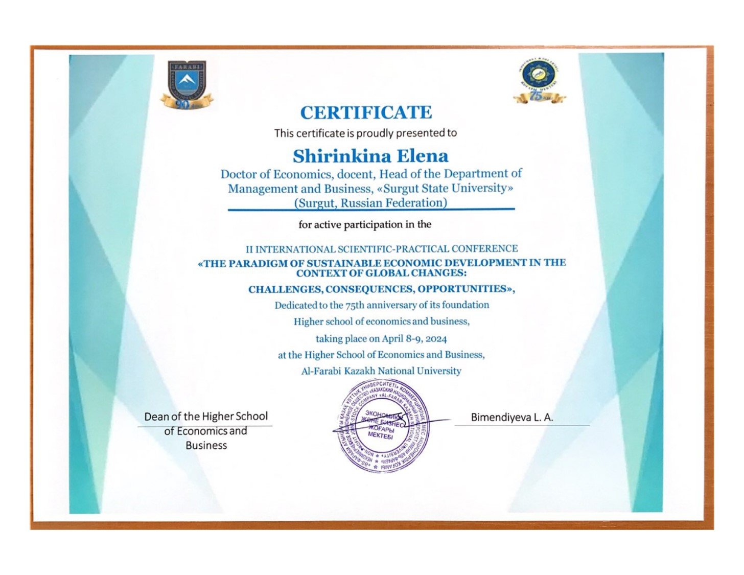 В Казахском национальном университете имени аль-Фараби (г. Алматы, Республика Казахстан) 8–9 апреля прошла ІІ Международная научно-практическая конференция «Парадигма устойчивого экономического развития в условиях глобальных перемен: вызовы, последствия, возможности», посвященная 75-летию Высшей школы экономики и бизнеса.