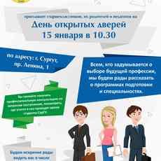 15 января приглашаем учащихся 10–11 классов на День открытых дверей Сургутского государственного университета. Ждем вас по адресу г. Сургут, пр. Ленина, 1 (театр, многофункциональный зал).