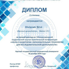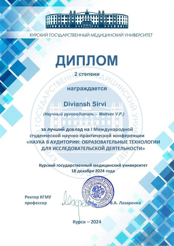 В Курском государственном медицинском университете в смешанной форме прошла I Международная студенческая научно-практическая конференция «Наука в аудитории: образовательные технологии для исследовательской деятельности». Научное событие объединило студентов, магистрантов и аспирантов из России, Белоруссии и Индии, активное участие в нем принял и третьекурсник направления «лечебное дело» Медицинского института Сургутского госуниверситета Дивианш Сирви.