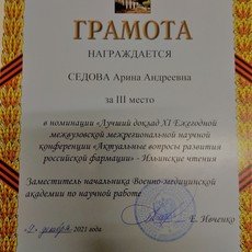 Студентка второго курса специальности «Сестринское дело» Медицинского колледжа Сургутского госуниверситета Арина Седова стала обладательницей диплома третьей степени XI Ежегодной межвузовской межрегиональной научной конференции «Актуальные вопросы развития российской фармации» – Ильинские чтения. Конференция прошла 9–10 декабря в Военно-медицинской академии им. С. М. Кирова (Санкт-Петербург).