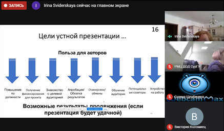 Эксперты поделились собственным опытом по поиску научных данных, определению актуальных экологических проблем региона, рассказали о сути, структуре, содержании научно-исследовательского проекта. О том, как сделать презентацию, которая будет не только радовать глаз аудитории, но и получит высокую оценку авторитетного жюри, поведала в онлайн-лекции кандидат биологических наук Ирина Свидерская. Презентация должна быть емкой по содержанию и краткой по объему, особая роль отводится и ее дизайну. Ирина Викторовна рекомендует использовать спокойные тона и обязательно ставить нумерацию слайдов. Отдельное внимание лектор уделила типичным ошибкам в формулировке целей и задач исследования. «Успех ученика зависит от грамотной работы его научного руководителя!», – с этих слов начала диалог с онлайн-слушателями кандидат биологических наук Ирина Гайдашева. Она посвятила свой доклад результатам работы. Обработка полученных результатов сводится к выявлению причинно-следственных связей исследуемых параметров процесса или явления, проверке гипотезы. Формулирование выводов позволяет оценить полученные результаты эксперимента. Для достижения этой цели следует логически простроить взаимосвязь результатов и имеющихся данных, взятых из источников, а затем подтвердить или же опровергнуть свою гипотезу. Ирина Игоревна также дала рекомендации по формулированию выводов (логика, краткость, конкретность), представлению результатов работы в форме устного или стендового доклада, компьютерной презентации.
