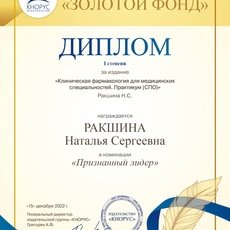 Кандидат биологических наук, преподаватель высшей категории Медицинского колледжа Сургутского госуниверситета Наталья Ракшина подготовила третье, переработанное и дополненное издание учебного пособия «Основы фармакологии с рецептурой». И одержала победу в номинации «Признанный лидер» IX Всероссийской книжной премии «Золотой фонд» за издание практикума по клинической фармакологии для СПО.