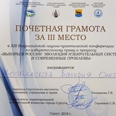Ее доклад «Праймериз в России: особенности проведения и регулирования», который она презентовала на XIII научно-практической конференции по избирательному праву и процессу, был опубликован в сборнике научных статей «Выборы в России: эволюция избирательных систем и современные проблемы». Это своего рода достижение, стимул двигаться вперед, глубже изучая данное направление юриспруденции.