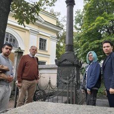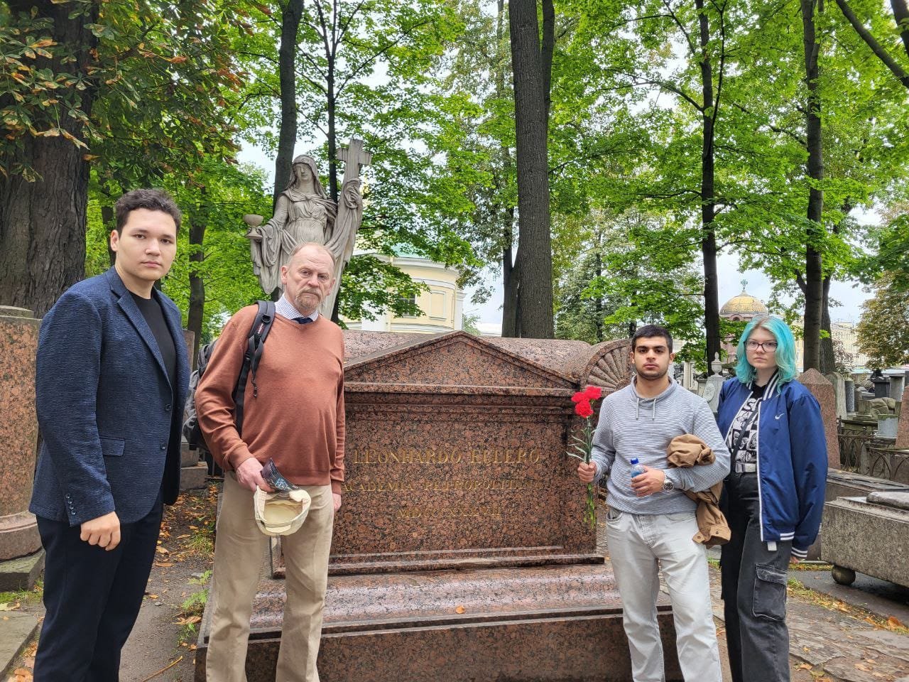 Фото 3- Победители олимпиады по сопромату 2024 года возлагают благодарственные цветы к могиле Леонарда Эйлера.