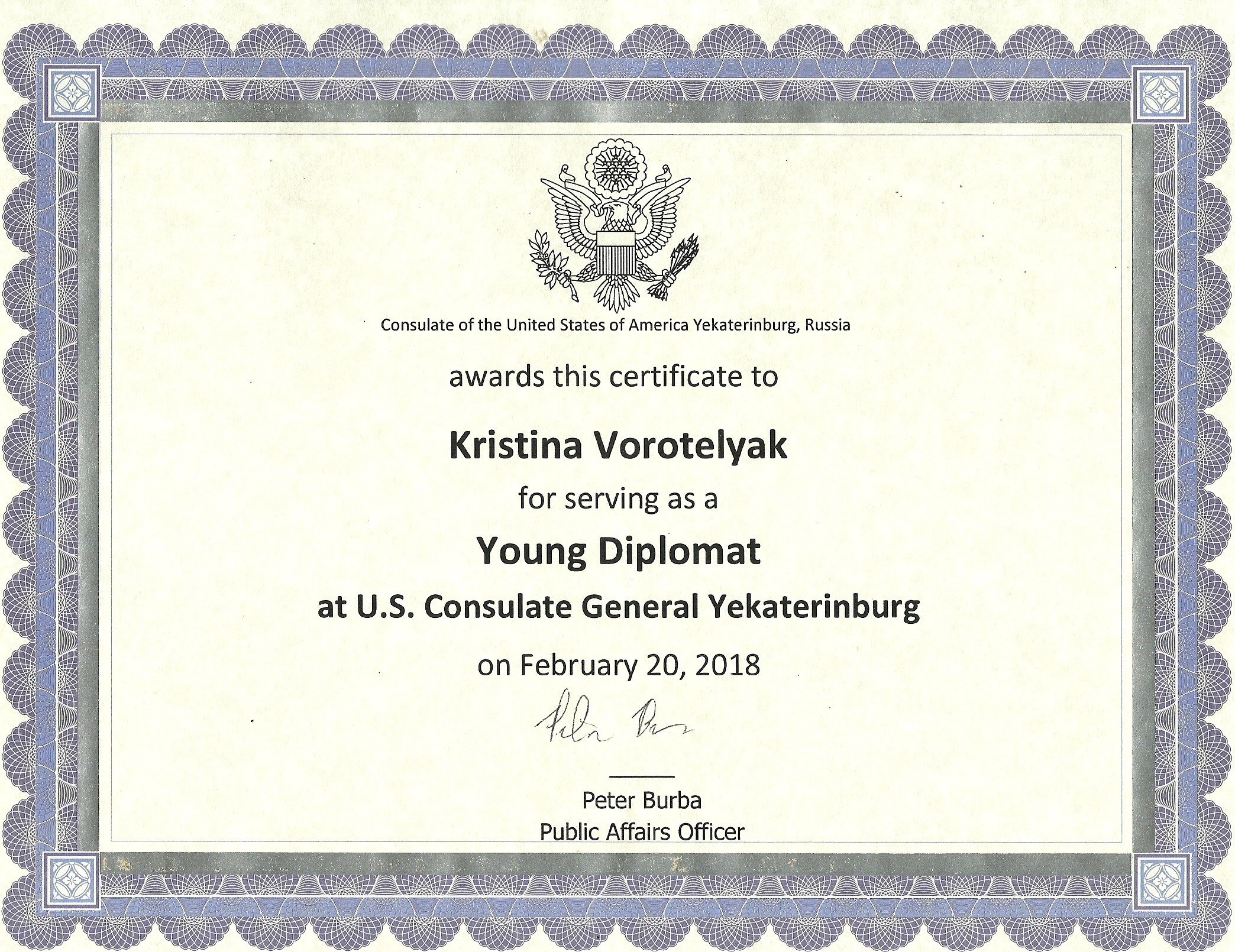Студенты Института гуманитарного образования и спорта факультета лингвистики Кристина Воротеляк, Анастасия Есипова, Гюнай Галандарова, Никита Голубников и Роксана Хачатрян получили уникальную возможность представить наш университет и познакомиться с работой дипломатов Генерального консульства США в Екатеринбурге.