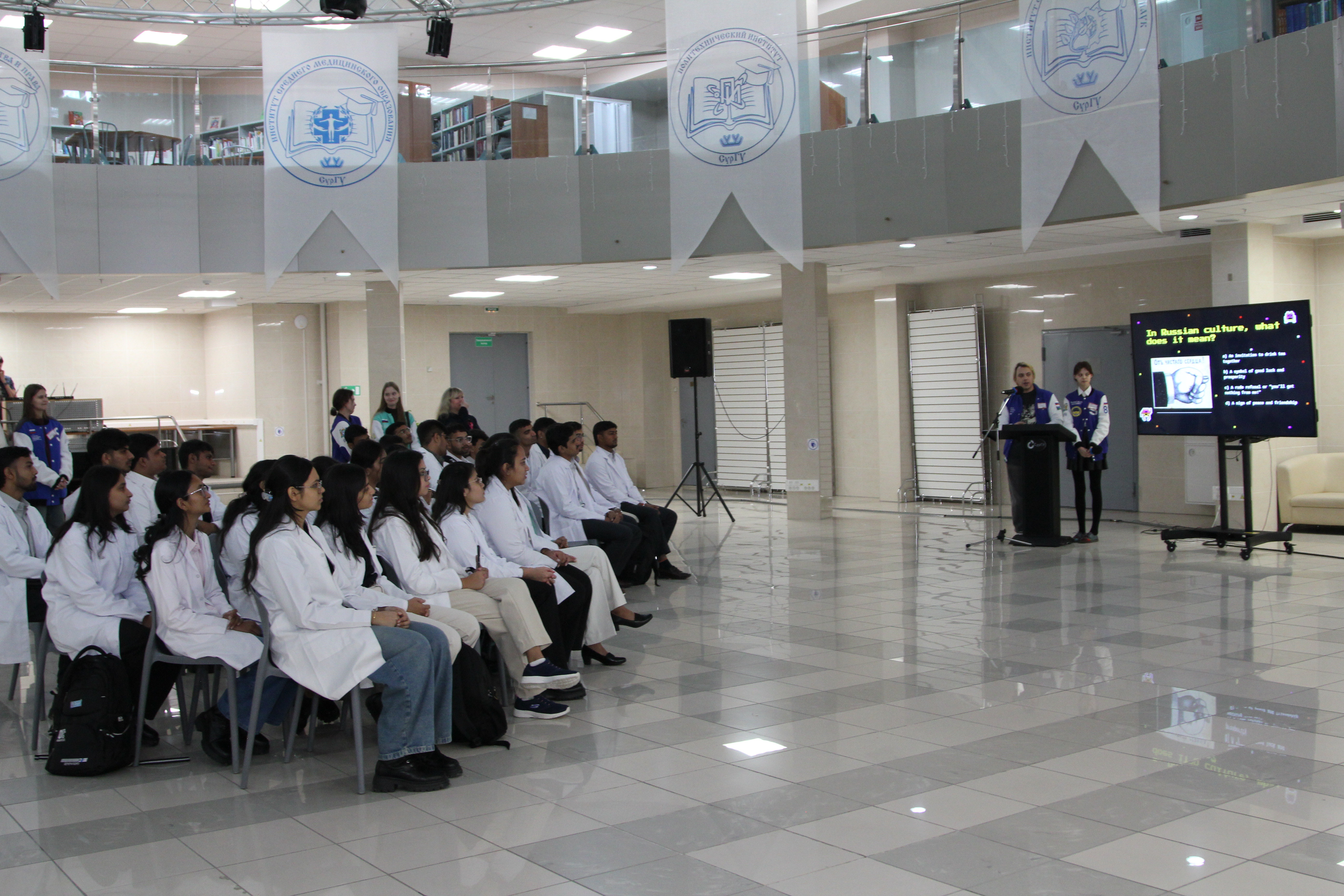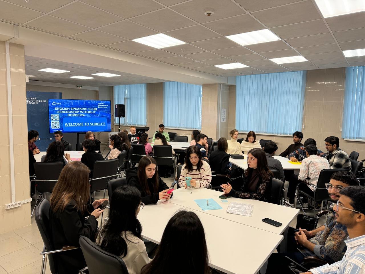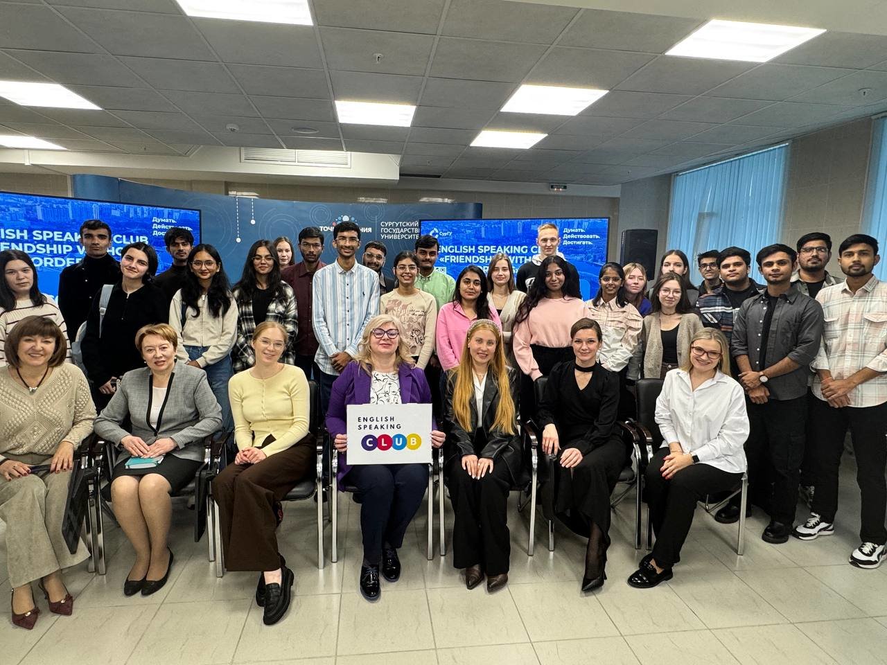 Заключительным мероприятием адаптационной недели стало заседание разговорного клуба «Дружба без границ», на котором студенты участвовали в увлекательных конкурсах на тему «Добро пожаловать в Сургут». Студенты из Индии с энтузиазмом работали в командах с российскими студентами, обсуждали варианты ответов, с увлечением знакомились с интересными фактами о Сургуте и Югре.